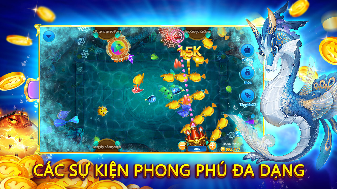 3A Trải nghiệm chất lượng hình ảnh giống phim điện ảnh 3A Nâng cấp hoàn toàn chất lượng hình ảnh,định nghĩa lại lần nữa chất lượng trò chơi bắn cá,thưởng thức chất lượng hình ảnh với độ phân giải cao như cảm giác trong phim Lối chơi mới- Ngư trường đặc sắc Cách chơi siêu mới thú vị gây nghiện, nâng cấp cổ vật, mở đầu một loạt các trò chơi bắt quái vật và trải nghiệm thêm nhiều niềm vui đột phá, lãnh hội ngư trường biển sâu đặc sắc Nâng cấp thần thú Tập kích thần bí Những cuộc công kích bất ngờ của các loài cá thần bí những vị thần thú cổ đại, tồn tại nhiều cơ hội cùng với mạo hiểm. Truy đuổi theo những con rồng cổ đại, cướp kho báu dưới biển sâu, pháo đạn ngàn lần, trở thành tỷ phú trong vài giây. Phúc lợi vô vàn Quà to gửi tặng Đăng nhập tặng ngay vô vàn phúc lợi, nâng cấp tặng VIP, người dùng mới tặng thưởng,hàng trăm triệu lợi ích thật tuyệt vời, để bạn xưng bá ngư trường và đạt đến đỉnh cao.